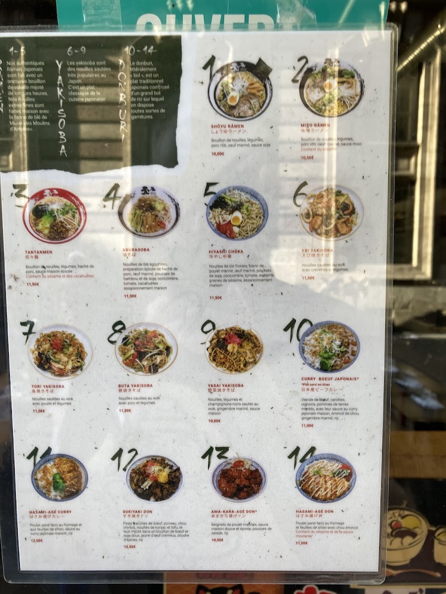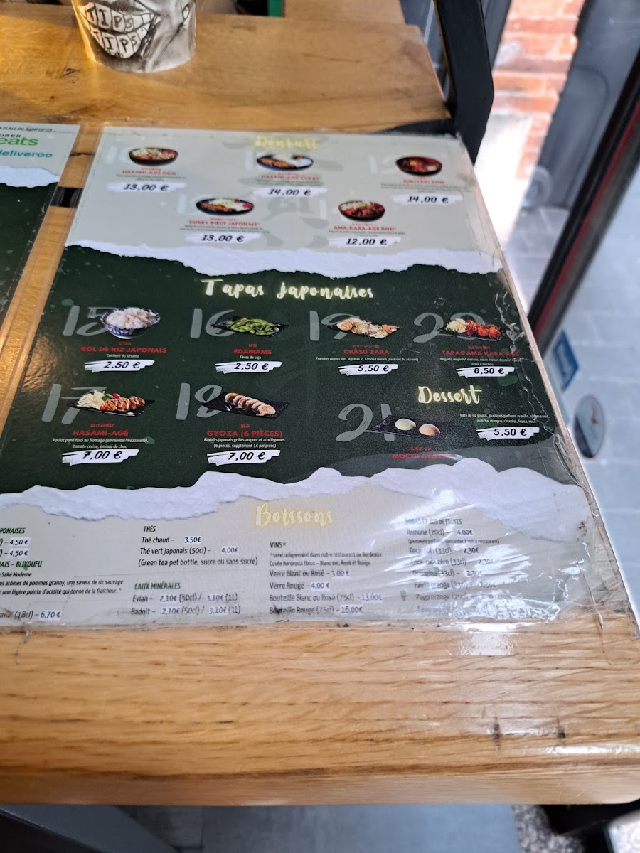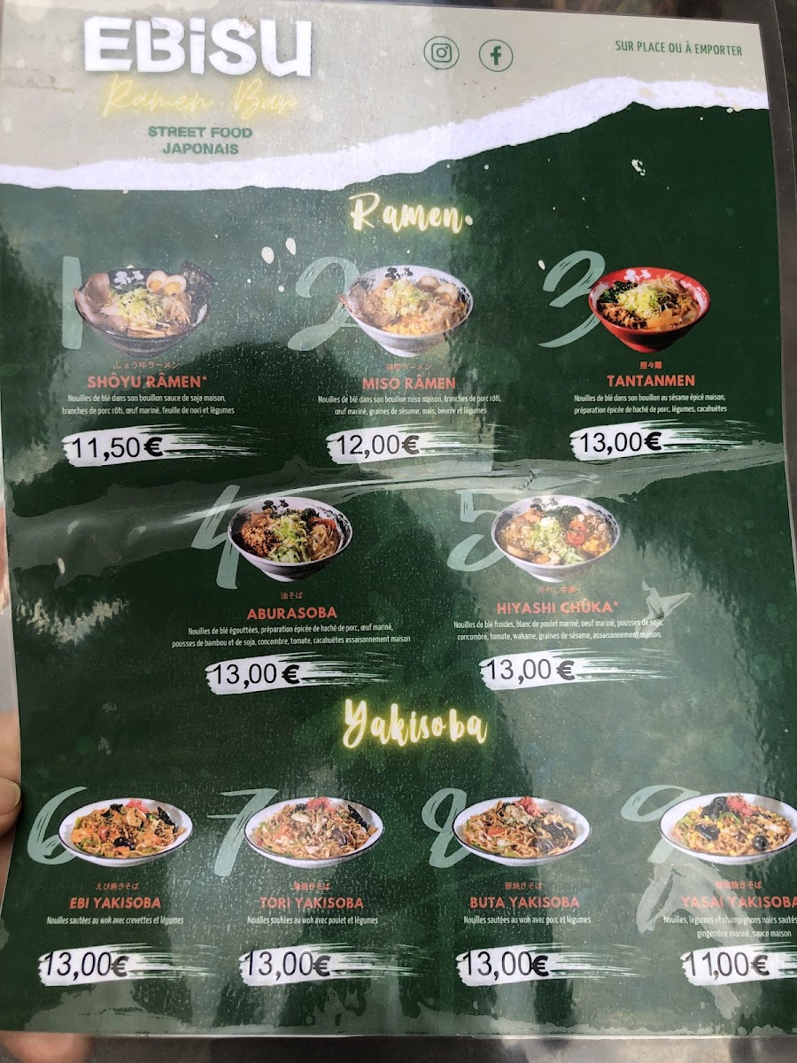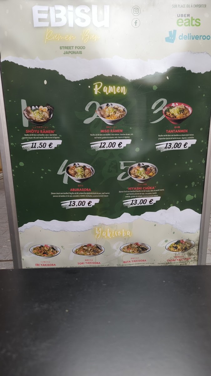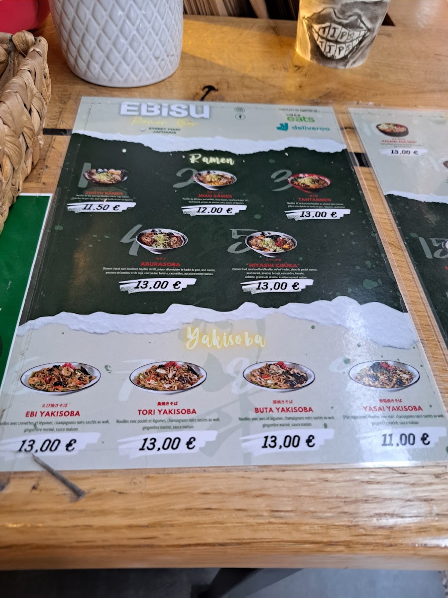 The menu at ebisu toulouse features a variety of Japanese dishes with a strong focus on ramen and related specialties. Visitors can expect several types of ramen, including Shôyu Ramen and Miso Ramen, alongside other noodle-based dishes such as Yakisoba in different variations like Tori Yakisoba, EBI Yakisoba, and Yasai Yakisoba.