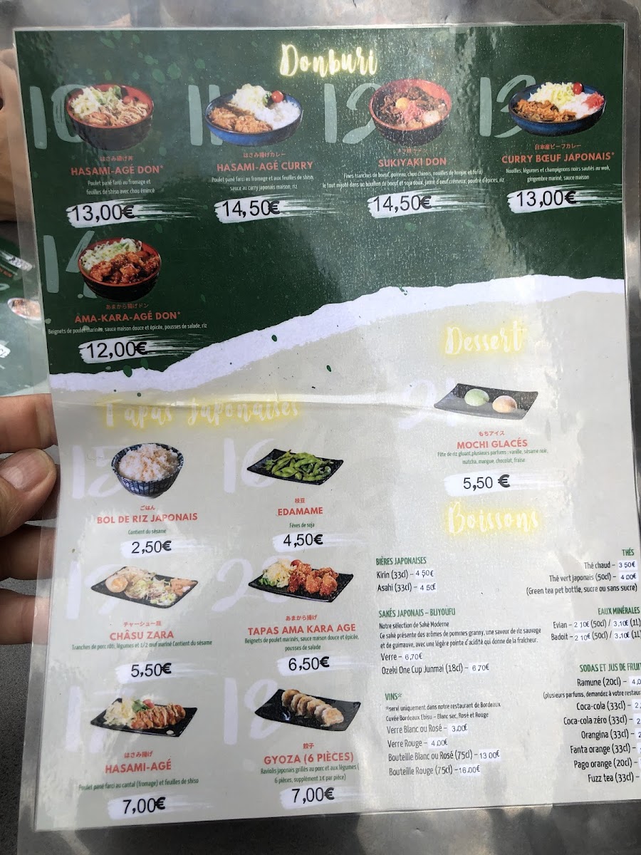 In addition to noodles, the menu includes rice bowls such as Ama-kara- Agé- Don and Hasami-agé Don, which typically feature fried proteins served over rice. There are also other protein options like Poulet Caramélisé and Poulet Pané Farci Au Fromage, reflecting a range of poultry preparations. Japanese-style curries like Curry Boeuf Japonais and Curry de Bœuf are part of the offering as well.